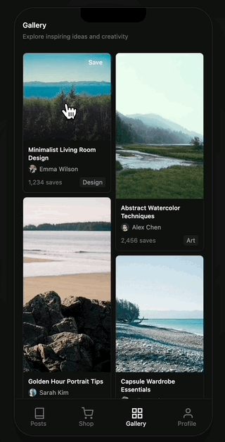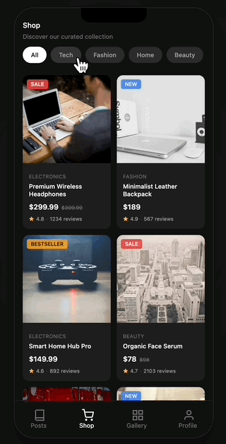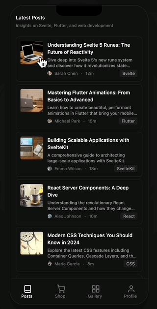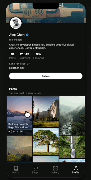 All transitions use spring-based physics animations. You can adjust speed and feel with the spring option.
